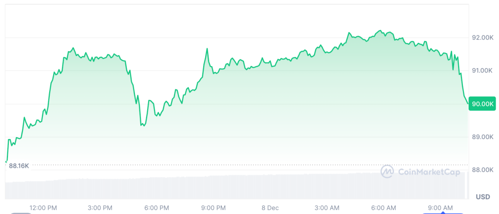 Bitcoin is now trading around $90,000 with a gain of about 1% over 24 hours, and that move has eased some of the pressure that defined recent sessions.