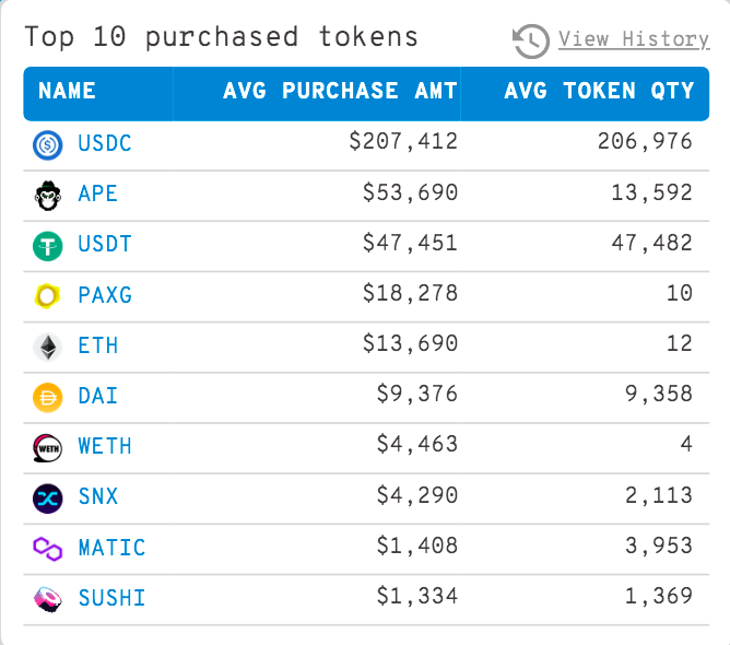 Fourth on the list is PAX Gold, an Ethereum-based token issued by blockchain infrastructure platform Paxos that’s backed by physical gold. The whales scooped up an average of 10 PAXG for a price tag of $18,278.