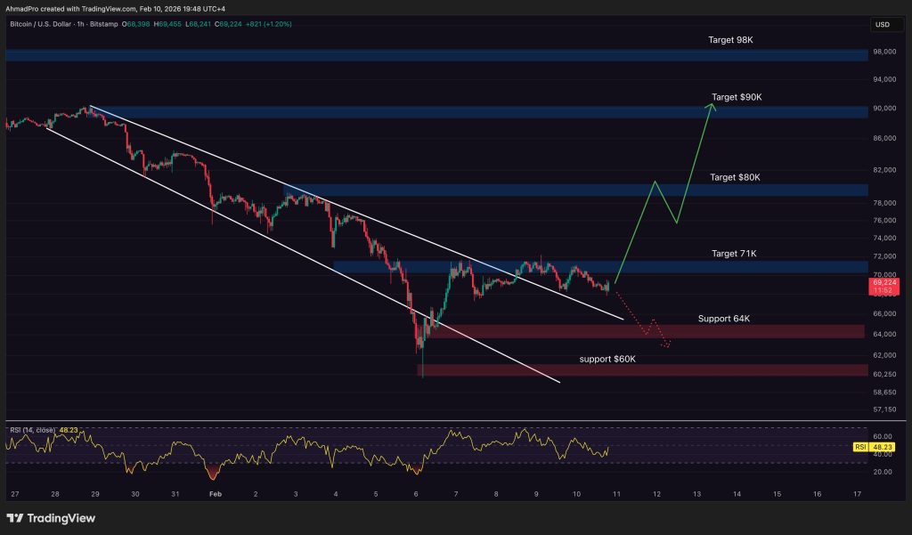 The current push into the $69K–$71K area looks more like another test of resistance than a confident recovery. A rejection here would open the door back toward $64K and potentially $60K, where panic usually peaks.
