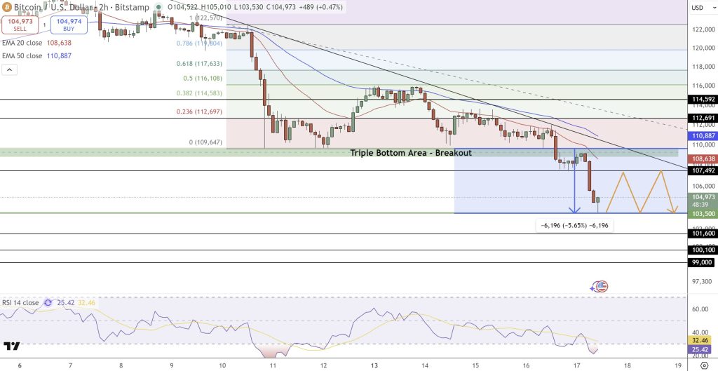 The RSI near 25 shows oversold conditions, hinting at possible relief. Still, without a confirmed bullish reversal, BTC could consolidate between $103,500 and $107,400 before choosing direction. Resistance sits at $107,500 and $110,800; failure to break above could pull prices back toward $101,600–$99,000.