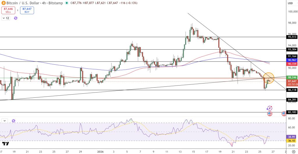 While the long-term narrative remains intact, Bitcoin’s short-term chart sits at a critical junction. After pulling back from the $95,500–$96,000 zone, BTC is consolidating between $86,000 and $88,000, an area where multiple technical levels converge.
