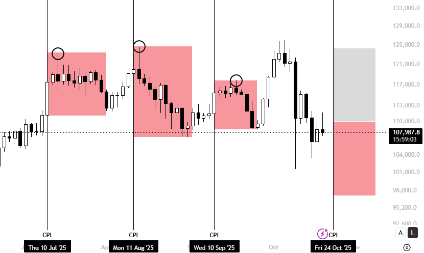 However, the setup looks different this time. Bitcoin is entering the CPI week already down over 3.5% in the past seven days, which could make it more sensitive to Fed rate cut relief rallies if inflation surprises to the downside.