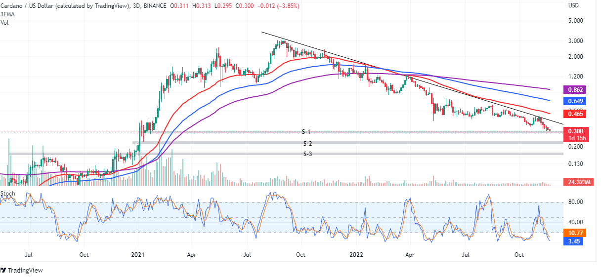 The Stochastic oscillator in the same 3-day timeframe confirms the strong bearish grip on the price. However, it also shows that ADA faces extremely oversold conditions that could pave the way for a recovery in the short term. Asset prices tend to return to fair market values. Hence, there is a chance for a short-term rally. That said, all momentum seems to point at the price breaking down, so bulls may need to wait for a strong green candle before jumping in.