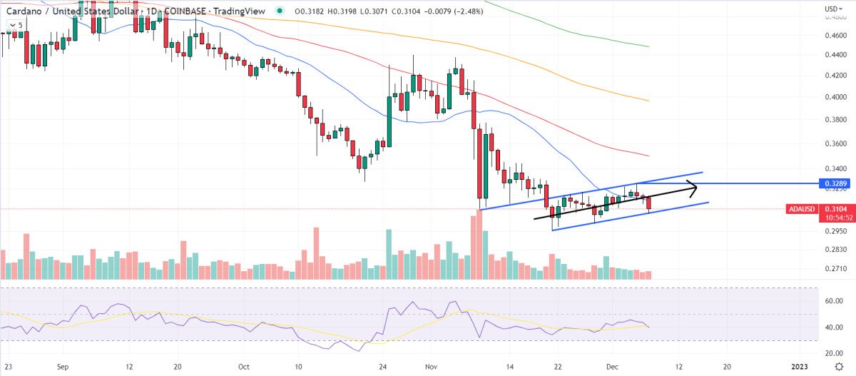 ADA/USD also remains capped by a longer-term downtrend that has been in play since the cryptocurrency hit its record highs above $3.0 back in mid-2021.