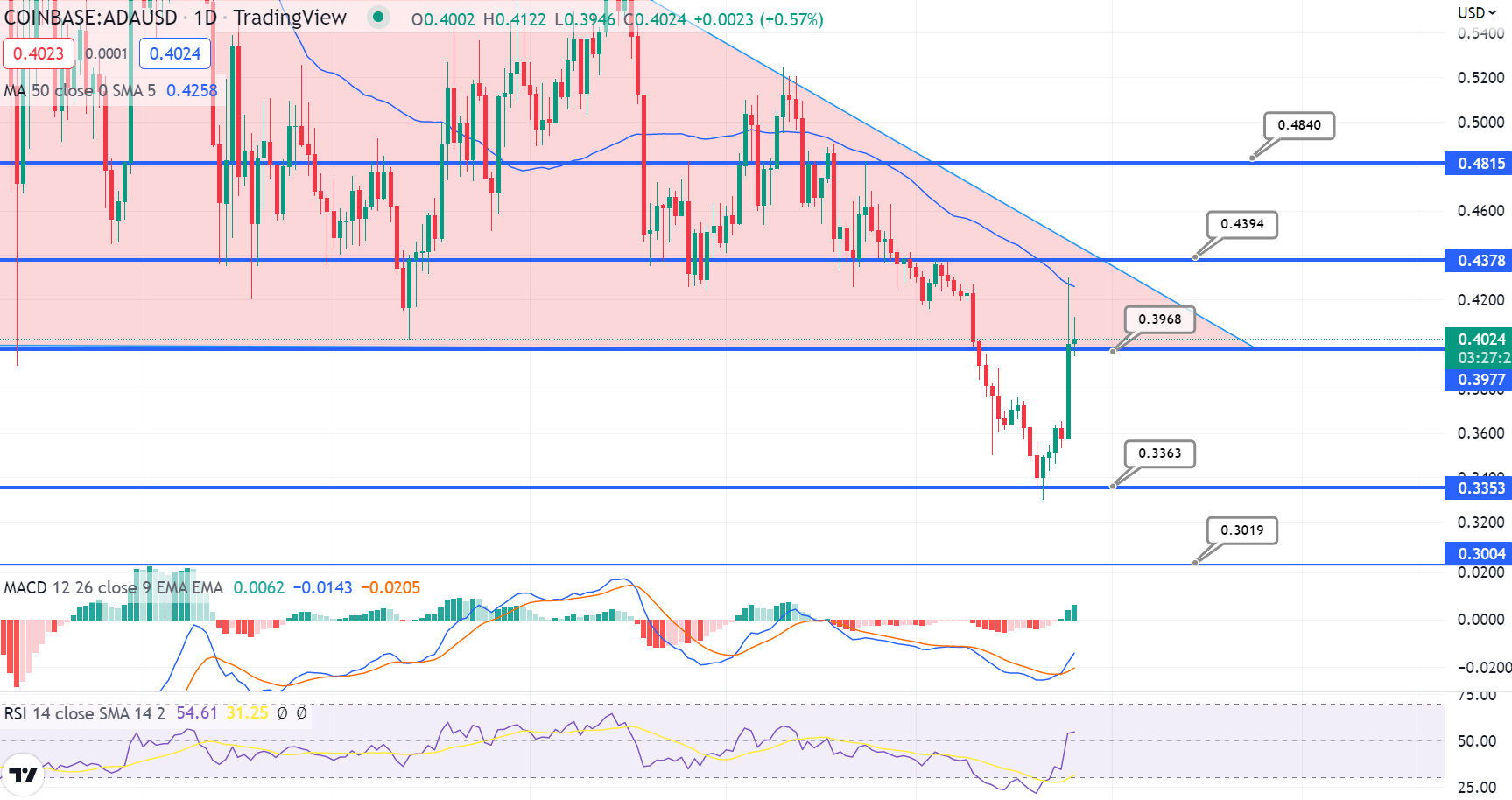 On the downside, ADA’s immediate support remains near $0.35, and a bearish breakout of this level could drive the price of ADA even lower, possibly to $0.30.