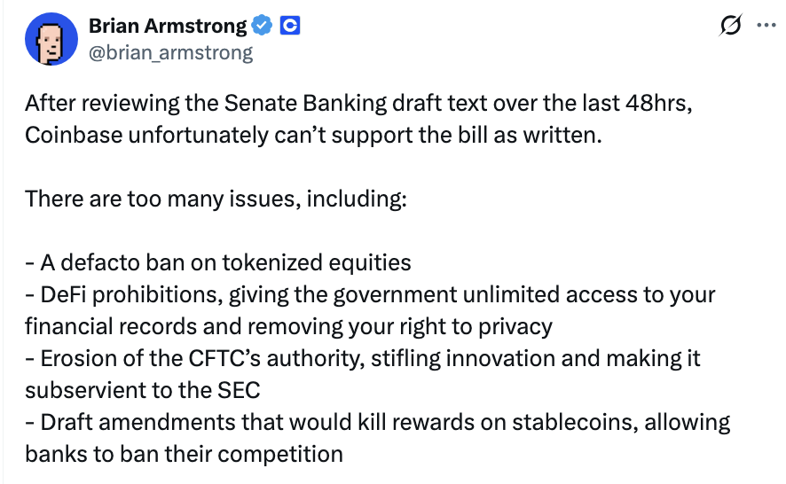 Armstrong posted his opposition on Wednesday after reviewing the text, writing, “After reviewing the Senate Banking draft text over the last 48hrs, Coinbase unfortunately can’t support the bill as written.”