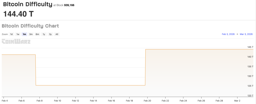 This push comes at a brutal time for miners. Network difficulty is sitting at 144.40 T, meaning 144.40 trillion hashes are needed to mine a single block. It has stayed elevated since mid-February, squeezing margins across the sector.