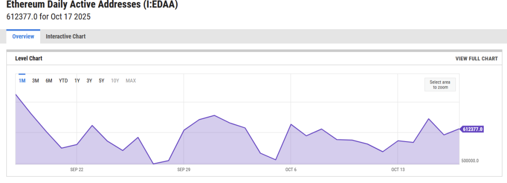 Ethereum’s daily active addresses climbed to 612,377 as of October 17, 2025, marking one of the strongest levels this month. Transaction volumes continue to hover above 1.6 million per day, while network fees exceeded $1.6 million in 24 hours, signaling sustained demand for block space.