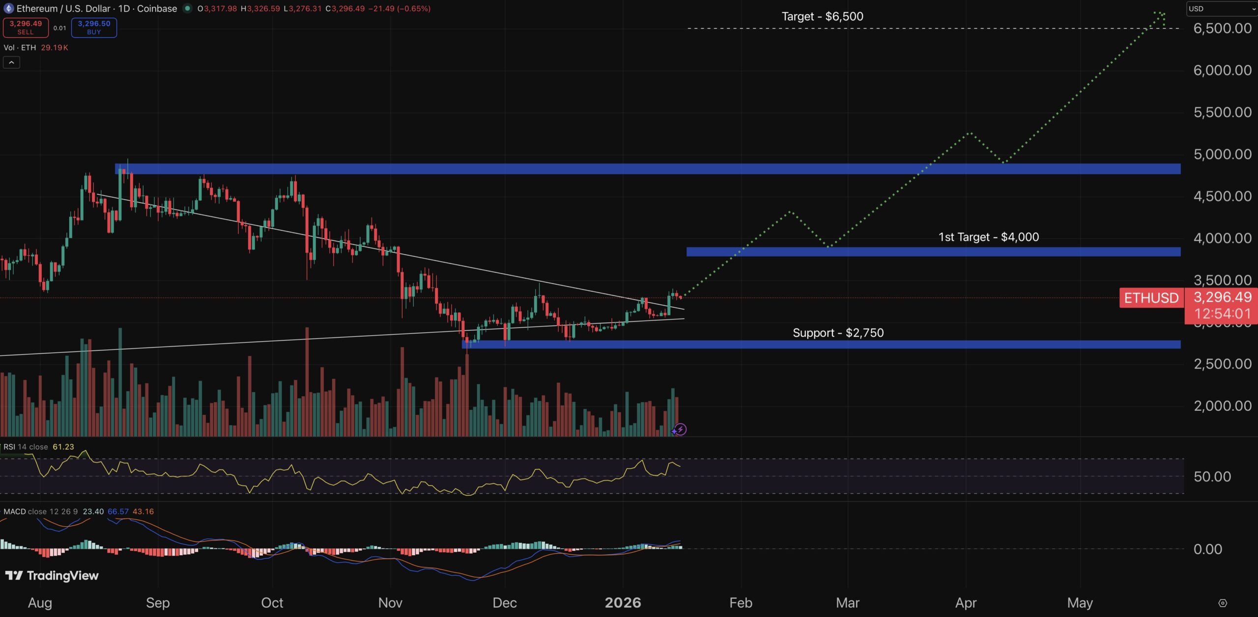 The future is therefore very bright for the token, with the Ethereum price likely to reach $4,000 by the end of Q1, and then $5,000 by H2.