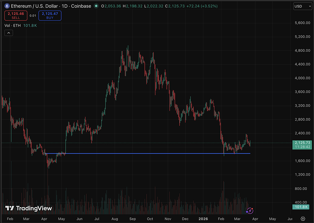Ethereum’s technical structure currently hinges on the $2,000 psychological barrier, a level that has acted as a pivot point throughout Q1 2026. While year-to-date performance shows a 31.1% decline, the asset has maintained an 7.7% gain over the last 30 days, indicating long-term resilience.
