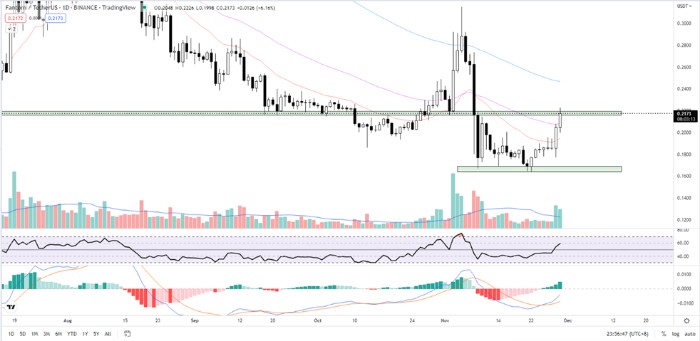 Fantom has been gaining momentum since Nov. 22 with the FTM price breaking out of EMA20 in the past days. As of writing, the coin has a strong follow-up to an initial rally that saw a rise of 15% in 24 hours at one point, with prices currently trading at $0.2187, up 9.62% for the day. The price is up over 32% since Nov. 22. Leading indicators RSI and MACD are showing a possibility of a healthy short-term bullish trend. Just how high can FTM go though?