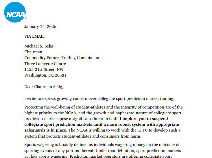 In a letter dated January 14, 2026, NCAA President Charlie Baker urged CFTC Chairman Michael Selig to halt collegiate sports prediction trading until stronger safeguards are put in place.