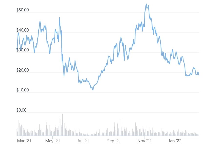 At 14:53 UTC, DOT, ranked 11th by market capitalization, traded at USD 18.64 and was down almost 3% in a day and 15% in a week. It also dropped 38% in a year.