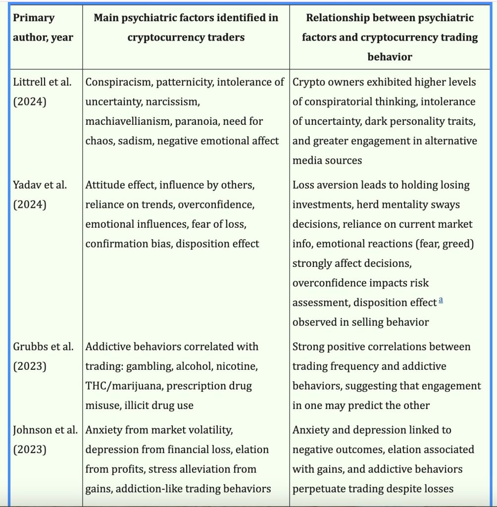 The report from NLM studied 11,177 participants across multiple countries. Based on behavioral traits, the report believes that crypto traders are more prone to anxiety and depression linked to negative outcomes. Traders may also exhibit elation associated with gains, along with addictive behaviors that may perpetuate trading despite losses.
