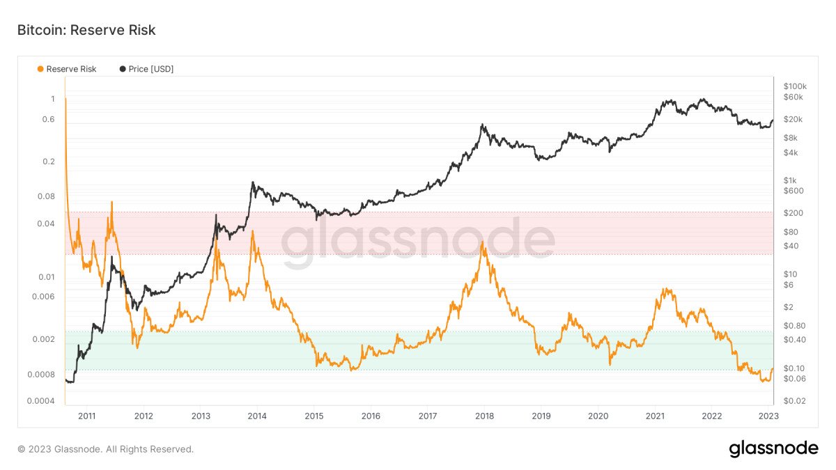 According to Glassnode, Reserve Risk is “used to assess the confidence of long-term holders relative to the price of the native coin at any given point in time”. Reserve Risk is “a long-term cyclical oscillator that models the ratio between the current price (incentive to sell) and the conviction of long-term investors (opportunity cost of not selling)”.