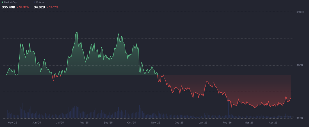Daily trading volume holds firm between $367M and $437M, signaling that demand hasn’t evaporated despite the drawdown.