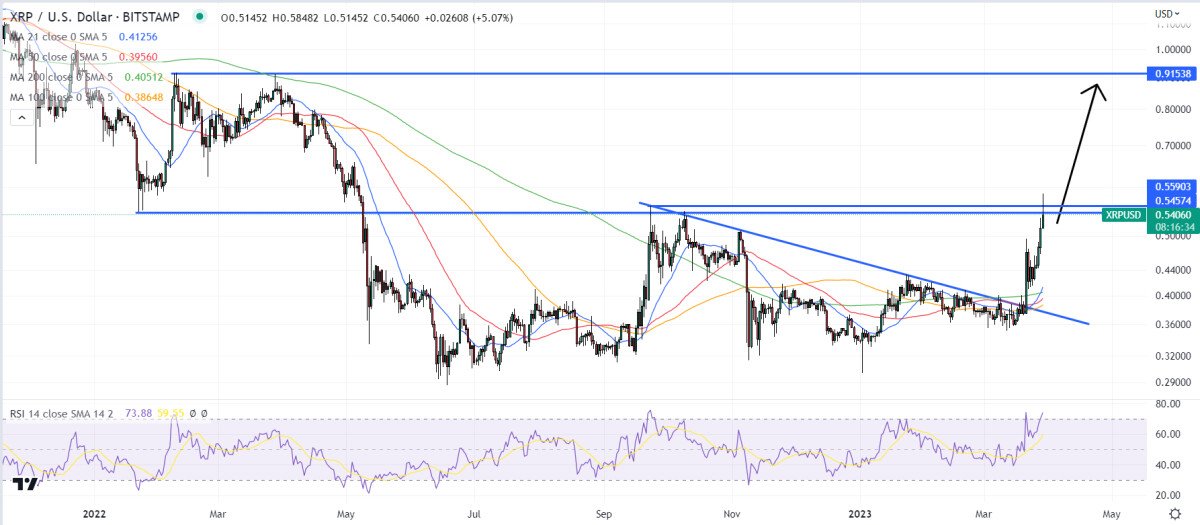 If XRP can close above the key long-term $0.55-56 resistance level, that would open the door to a rally to the next major resistance area around $0.90.